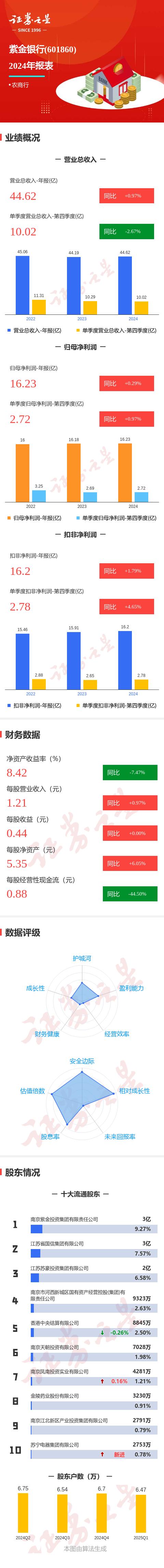 证券之星消息,紫金银行2024年年报显示,公司主营收入44.63亿元,同比上升0.98%;归母净利润16.24亿元,同比上升0.3%;扣非净利润16.2亿元,同比上升1.8%;其中2024年第四季度,公司单季度主营收入10.02亿元,同比下降2.67%;单季度归母净利润2.72亿元,同比上升0.98%;单季度扣非净利润2.78亿元,同比上升4.66%;负债率92.61%,投资收益5.39亿元。